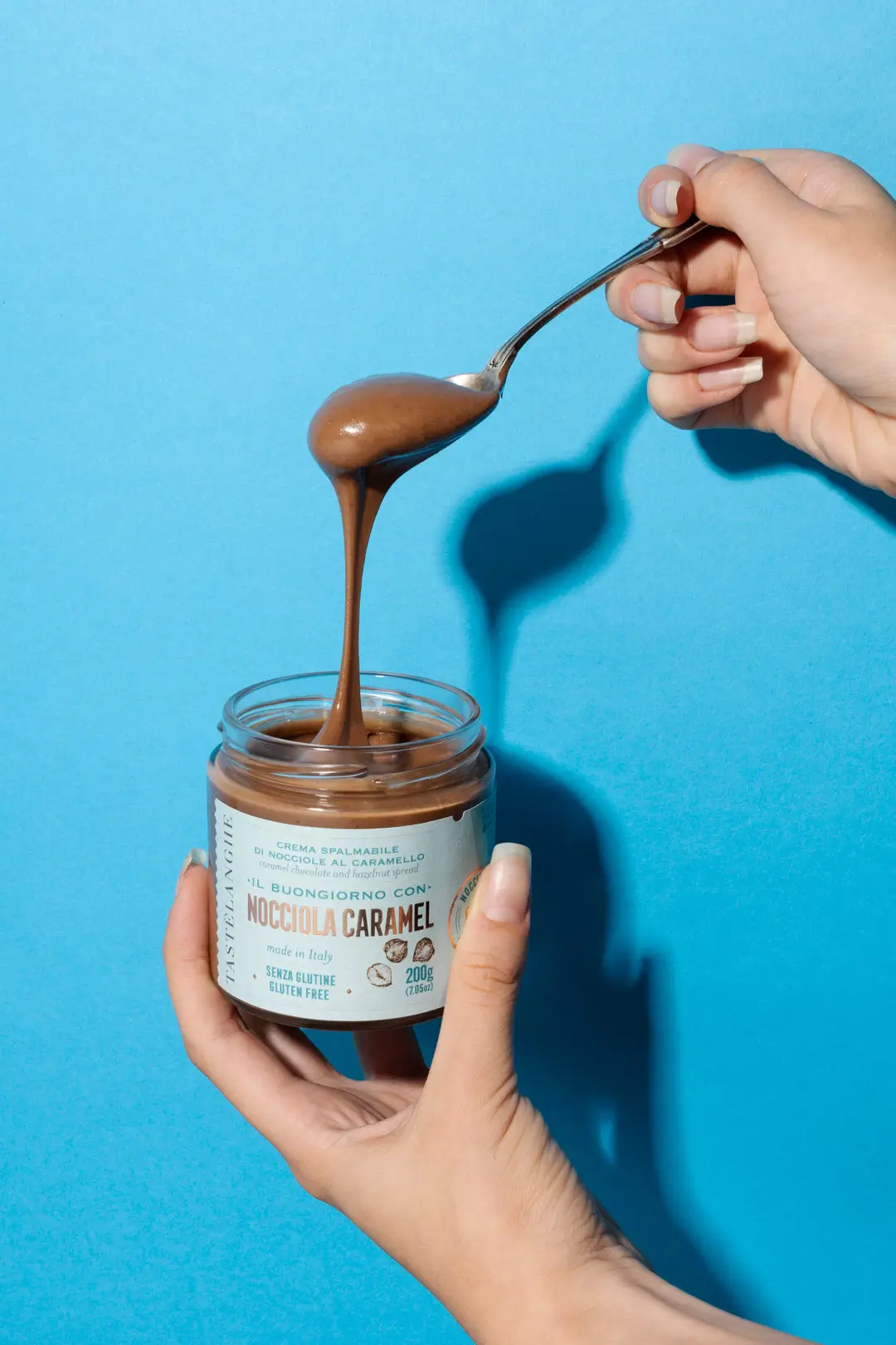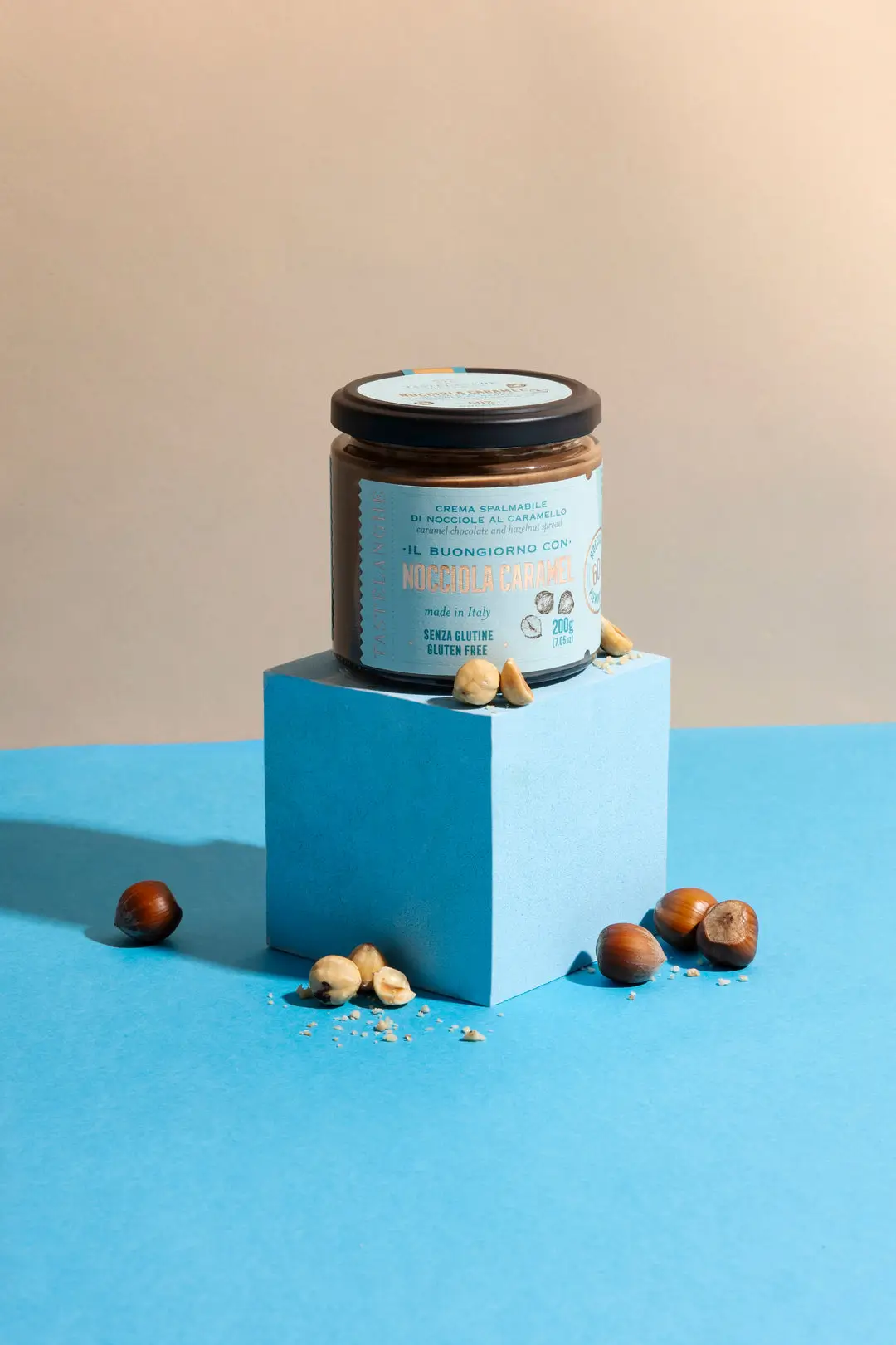 TAS01CR200 Čokoládová nátierka s karamelom a lieskovcami (60 %), 200 g. Bez lepku.Zloženie: piemontské lieskovce IGP z Langhe (60 %), trstinový cukor, kakaové maslo, sušené odstredené mlieko, kakaová hmota, kakaový prášok, extrakt z bourbon vanilky, emulgátor: sójový lecitín.Môže obsahovať stopy iných orechov.